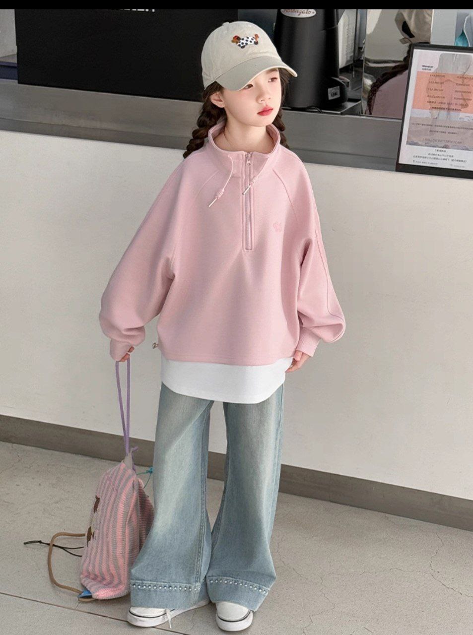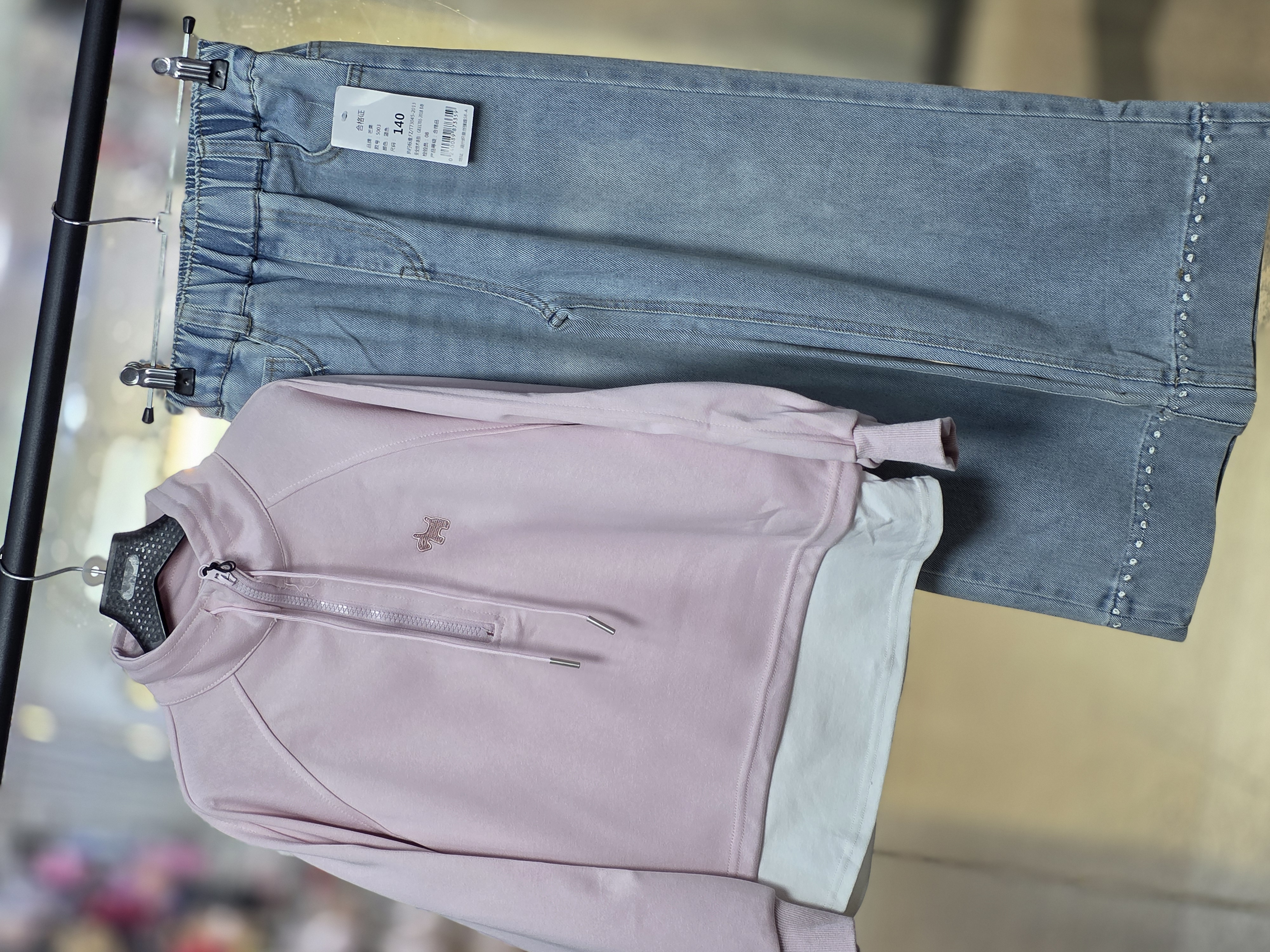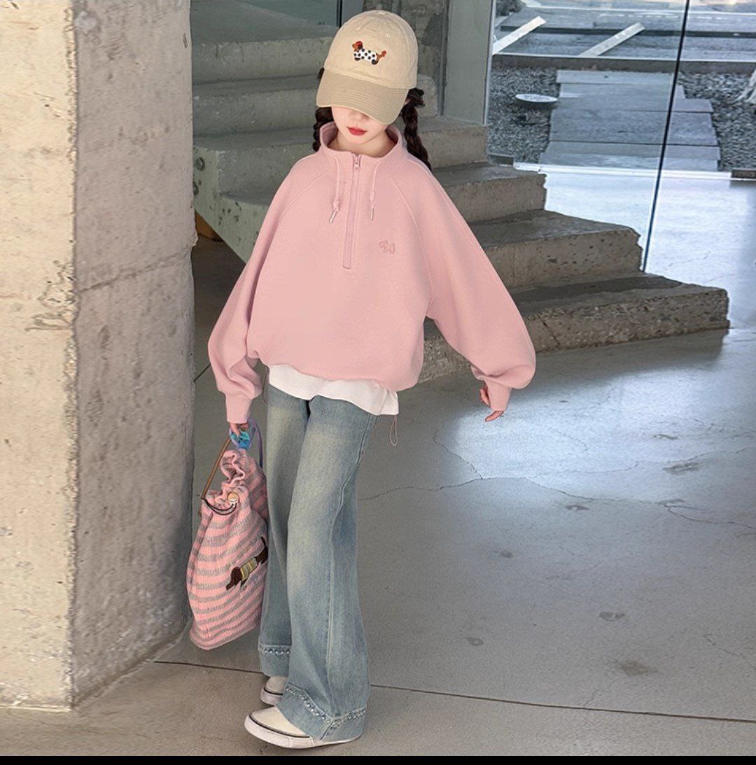 ست دو تیکه دخترانه وارداتی هودی نیم زیپ صورتی با شلوار لی 5 تا 14 سال