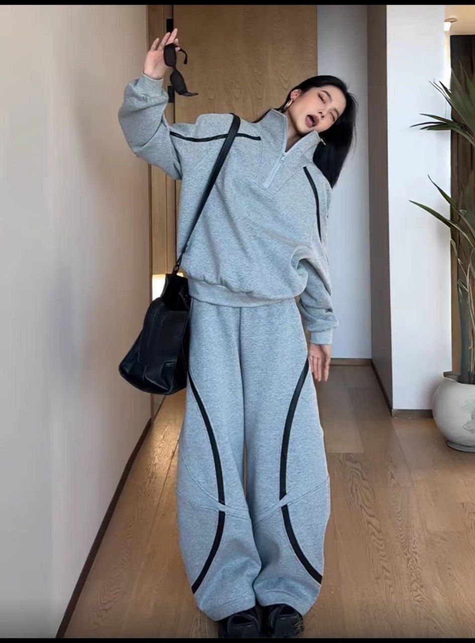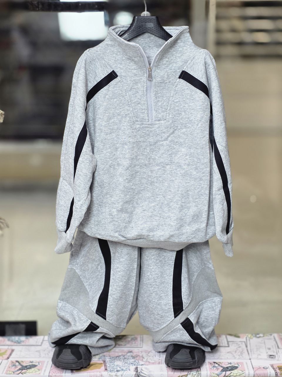 ضخامت پارچه این ست متوسط و مناسب فصل پاییز و بهار می باشد و جنس پارچه این ست درصد بالایی پنبه و در رنگ بندی طوسی می باشد در سایز بندی 120 تا 160 که مناسب 5 تا 12 سال می باشد .شلوار این ست فول بگ می باشد
