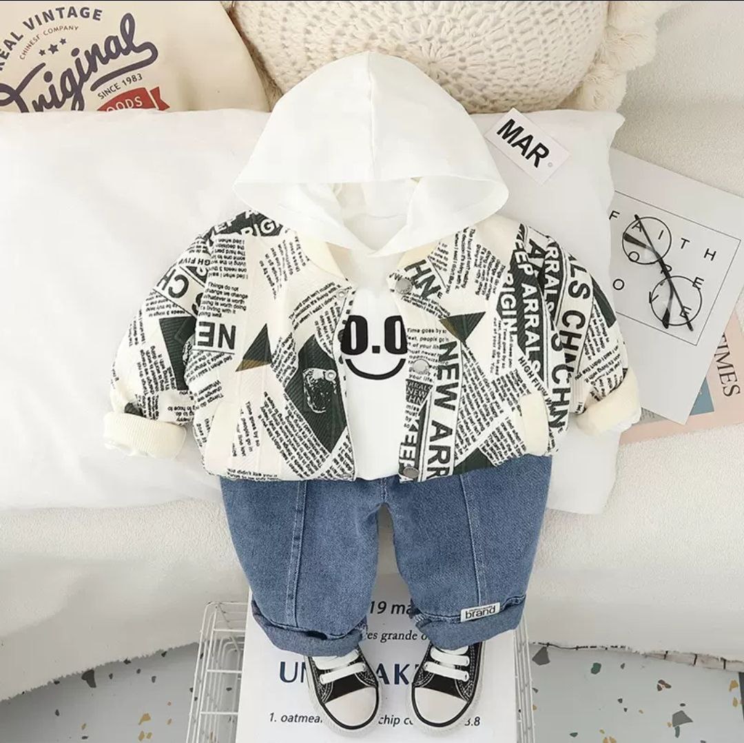 ست سه تیکه سوئیشرت طرح روزنامه ی با تی شرت و شلوار لی 1 تا 5 سال